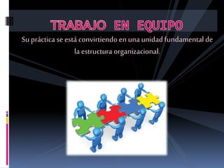 El documento describe los equipos de trabajo como una unidad fundamental en las organizaciones. Explica que los equipos se caracterizan por trabajar juntos, compartir objetivos e inclusión. También analiza factores como la presión por ajustarse al grupo, el aislamiento de miembros más productivos, y la necesidad de unanimidad sobre la evaluación objetiva.