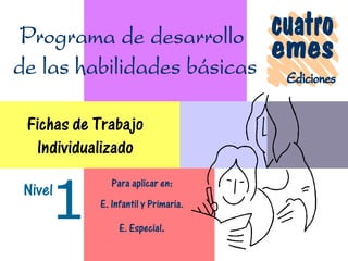 Este documento presenta un programa de desarrollo de habilidades básicas para alumnos de educación infantil, primaria y especial. Incluye sugerencias metodológicas, actividades para el desarrollo de habilidades como la discriminación visual, conceptualización, lateralidad, percepción espacial y temporal, reconocimiento de fonemas y grafías, y grafomotricidad. El material se presenta en cuadernillos de trabajo individualizados para cada nivel.