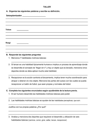 El documento aborda el desarrollo de habilidades motrices básicas en niños de 6 a 12 años, destacando la importancia de la coordinación y el equilibrio. Estas habilidades incluyen desplazamientos, saltos y giros, esenciales para la vida cotidiana y el aprendizaje motor. Se enfatiza la relación entre habilidades motrices y perceptivas, así como la necesidad de practicar estas habilidades en el contexto de la educación física.