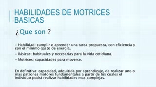 Este documento describe las habilidades motrices básicas, que son capacidades motoras necesarias para la vida diaria y la base para habilidades más complejas. Explica que las habilidades motrices básicas incluyen desplazamientos como caminar, correr y trepar, así como saltos, giros, lanzamientos y recepciones. Luego procede a definir y describir varios tipos específicos de desplazamientos, incluidos la marcha, la carrera, las cuadrúpedas, las reptaciones, los deslizam