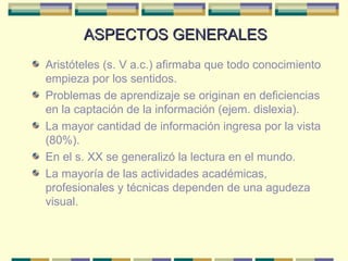 El documento habla sobre las habilidades visuales para el aprendizaje. Explica que la mayor parte de la información ingresa a través de la vista y que muchas actividades dependen de una buena agudeza visual. Distingue entre vista y visión, siendo esta última un proceso intelectual. Enumera habilidades visuales como los movimientos oculares, la binocularidad y la percepción visual que afectan el rendimiento académico. Finalmente, describe posibles deficiencias relacionadas a la coordinación ojo-mano y sugerencias para trabajar