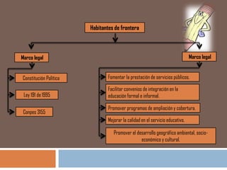 Este documento resume el marco legal para la educación de los habitantes de frontera, incluyendo la Constitución Política, la Ley 191 de 1995 y el Conpes 3155. Describe la necesidad de identificar las poblaciones de frontera, realizar un inventario de proyectos escolarizados, formular objetivos de un plan de acción, y delimitar estrategias institucionales, pedagógicas y financieras para atender a estas poblaciones. También cubre el seguimiento y evaluación de estos procesos educativos.
