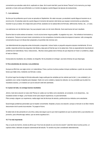 Este documento ofrece consejos sobre cómo estudiar de manera efectiva. Reconoce que la inteligencia varía entre personas, pero que con motivación y esfuerzo la mayoría pueden tener buenos resultados académicos. Ofrece recomendaciones prácticas como encontrar un lugar tranquilo para estudiar, tomar buenos apuntes en clase, estudiar de forma constante un poco cada día en lugar de dejar todo para el último momento, y pedir ayuda si se tienen dificultades.
