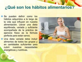 Los hábitos alimentarios se definen como los hábitos adquiridos a lo largo de la vida que influyen en nuestra alimentación. Una dieta equilibrada y variada que incluya alimentos de todos los grupos en cantidades suficientes, acompañada de ejercicio físico, promueve la salud. Los hábitos alimentarios también están influenciados por factores culturales, religiosos, económicos y educativos.