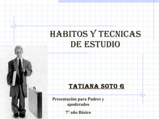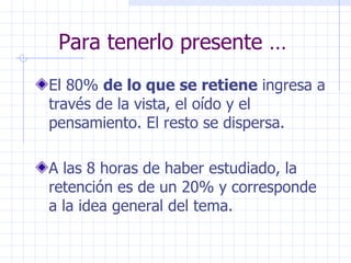 Este documento presenta información sobre hábitos y técnicas de estudio efectivos para estudiantes. Explica que el aprendizaje implica un cambio duradero en la capacidad o conducta de una persona. Entre los factores que favorecen el aprendizaje se encuentran factores cognitivos, afectivos y ambientales. También describe las estrategias básicas para un estudio eficaz, como leer de forma comprensiva, hacer resúmenes y esquemas, y tomar apuntes. Además, enfatiza la importancia de desarrollar