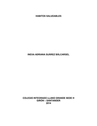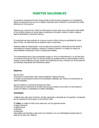 El documento describe la importancia de que los niños adquieran hábitos saludables de higiene personal e higiene del entorno en la escuela y en casa. Se detallan actividades y talleres realizados en una escuela para promover la higiene bucal, personal, del cabello, de las manos y los pies. También se enfatiza el papel fundamental de los padres y maestros en enseñar a los niños estos hábitos desde edades tempranas para su bienestar y desarrollo saludable.