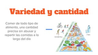 Este documento proporciona consejos sobre hábitos alimenticios saludables, recomendando comer una variedad de alimentos en cantidades moderadas a lo largo del día, consumir frutas y verduras por sus fibras y proteínas de la carne y el pescado, no abusar de las grasas animales, huevos o ácidos grasos saturados, beber de 1,5 a 2 litros de agua y limitar la sal y comida basura.