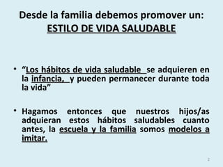 Este documento trata sobre la promoción de hábitos de vida saludables en niños. Resalta que los hábitos de vida saludable se adquieren en la infancia y pueden durar toda la vida. La escuela y la familia deben ser modelos a seguir e inculcar hábitos como una alimentación balanceada, ejercicio físico regular, buena higiene y prevención de enfermedades. También discute recomendaciones nutricionales específicas para diferentes edades infantiles.