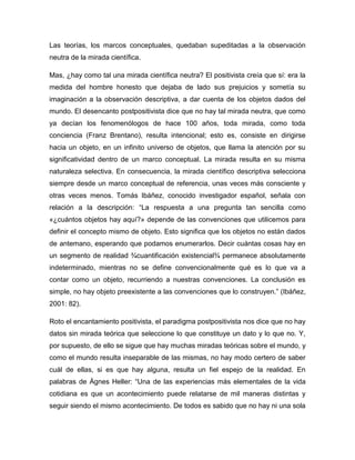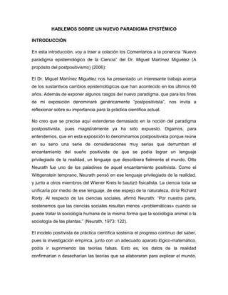 Este documento resume un artículo sobre el nuevo paradigma epistemológico postpositivista. Explica que el positivismo creía en un lenguaje privilegiado para describir la realidad de forma neutral, pero el postpositivismo reconoce que toda mirada científica se realiza desde un marco conceptual. También señala que la ciencia busca entender cómo funciona la naturaleza basándose en imágenes del mundo que influyen en su práctica y pueden tener consecuencias éticas.