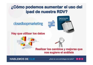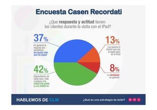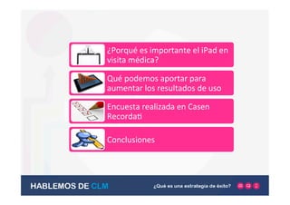 Este documento presenta los resultados de una encuesta realizada por Casen Recordati sobre el uso de tabletas en visitas médicas. La encuesta encontró que las visitas con tabletas, ya sea de forma exclusiva o acompañadas de material impreso, representan el mismo volumen de visitas que el uso exclusivo de material impreso. Además, las visitas personales y el uso de tabletas son las opciones preferidas por los médicos. El documento concluye resaltando la importancia de analizar continuamente la efectividad de los materiales para mejorar la comunicación con los clientes.