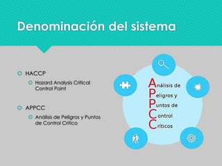 El documento describe los sistemas HACCP y ISO 22000 para garantizar la seguridad alimentaria. HACCP sigue 7 principios clave como identificar peligros y establecer puntos de control crítico. ISO 22000 es una norma internacional que abarca toda la cadena de suministro para prevenir riesgos y proteger la marca. Ambos sistemas mejoran la inocuidad de los alimentos y promueven el comercio.