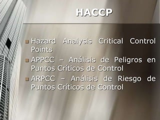 Este documento describe el sistema HACCP (Análisis de Peligros y Puntos Críticos de Control), su origen en la industria alimentaria para garantizar la seguridad de los alimentos para astronautas y los 7 principios fundamentales del sistema: 1) análisis de peligros, 2) determinación de puntos críticos de control, 3) establecimiento de límites críticos, 4) vigilancia de los puntos críticos, 5) medidas correctivas, 6) verificación y 7) registros y documentación. El objetivo final del sistema