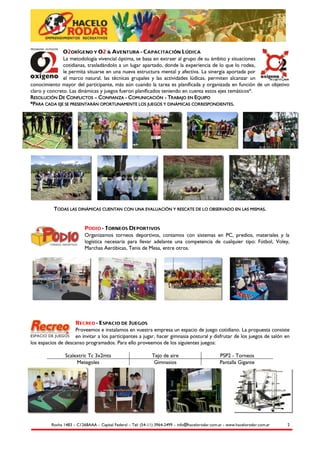 El documento presenta varios programas recreativos y de capacitación lúdica de una empresa llamada HACELO RODAR, incluyendo juegos gigantes, torneos deportivos, circuitos de juegos, pistas de educación vial y kermeses tradicionales, todos supervisados por coaches ontologicos y con evaluaciones. Los programas se adaptan al objetivo y estilo del evento y combinan diversión, rendimiento y objetivos como la formación de equipos e innovación.