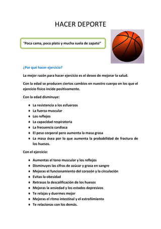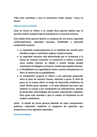 El documento habla sobre los beneficios del ejercicio físico para la salud y el envejecimiento. Con la edad, el cuerpo experimenta cambios como la disminución de la resistencia, fuerza muscular y capacidad respiratoria, pero el ejercicio puede ayudar a aumentar el tono muscular, mejorar la circulación, prevenir la obesidad y retrasar la pérdida ósea. También mejora el estado de ánimo y la calidad del sueño. Para estar en forma, se debe mantener una buena capacidad cardiovascular, fuerza muscular, flexibilidad