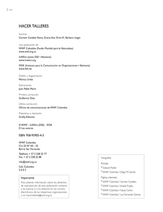 Este documento presenta una guía práctica para capacitadores que busca ayudarlos a organizar y ejecutar talleres de capacitación de manera efectiva. Explica los conceptos y enfoques de aprendizaje, comunicación y participación que fundamentan el manual. Además, provee información sobre la organización, ejecución y evaluación de talleres, así como una variedad de herramientas metodológicas para promover la participación. El manual fue desarrollado de manera conjunta por WWF Colombia, DSE e IFOK, con base