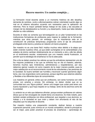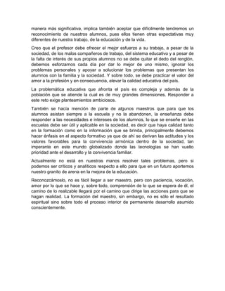 Este documento discute los desafíos de ser maestro y la importancia de la formación de maestros. Ser maestro requiere enfrentar retos como los estados de ánimo cambiantes de los estudiantes y asegurar que la enseñanza satisface sus necesidades e intereses. Los maestros deben mantener altos estándares éticos y continuar su aprendizaje a lo largo de su carrera a pesar de las dificultades del sistema educativo y la falta de reconocimiento. Formar buenos maestros requiere un enfoque