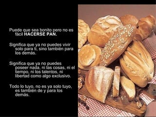 El documento compara la vida de una persona dedicada a servir a los demás con el proceso de hacer pan, argumentando que al igual que el pan se deja amasar, cocer y partir para alimentar a otros, uno debe estar disponible para servir humildemente a los demás con paciencia, bondad y amor, incluso cuando eso requiere sacrificio.