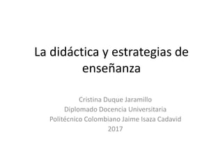 Este documento define la didáctica como el conjunto de metodologías y técnicas para mejorar la enseñanza y lograr llegar de forma eficaz a los estudiantes. Explica que los componentes principales de la didáctica son el método, la estrategia y la técnica. Proporciona ejemplos de cada uno y cómo se relacionan entre sí para lograr los objetivos de aprendizaje, como una estrategia de enseñanza a través de resúmenes y una técnica de estudio de caso.