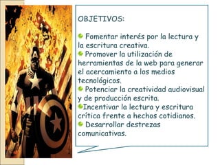 El documento describe un proyecto para fomentar la lectura, escritura y creatividad en los estudiantes a través del uso de comics y herramientas web. El proyecto busca promover el interés por la lectura y escritura, desarrollar habilidades comunicativas y de producción audiovisual, e incentivar una lectura y escritura crítica de los hechos cotidianos.