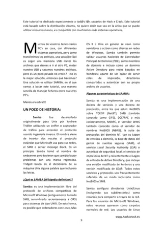 Este documento proporciona una introducción a Samba, incluyendo su historia, definición, características e instrucciones para instalarlo y configurarlo. Explica que Samba permite compartir archivos entre sistemas Windows y Unix/Linux, y fue desarrollado originalmente para permitir el acceso a archivos SMB de Windows desde sistemas Unix. Luego guía al lector a través de los pasos para instalar Samba en Ubuntu y modificar su archivo de configuración smb.conf.