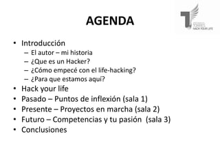 El documento presenta una agenda para una charla sobre cómo hackear tu vida. La agenda incluye una introducción del orador, una definición de hacker, cómo el orador empezó con el life-hacking y el propósito de la charla. Luego se divide en secciones sobre el pasado, presente y futuro, concluyendo que los asistentes deben alinear sus proyectos con sus talentos y pasiones para crear su futuro ideal.