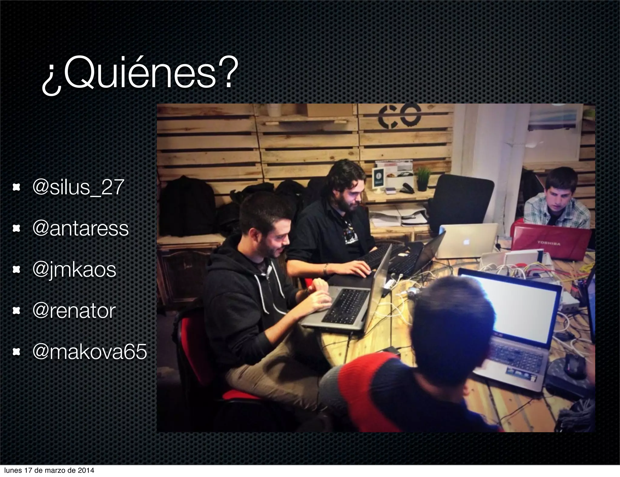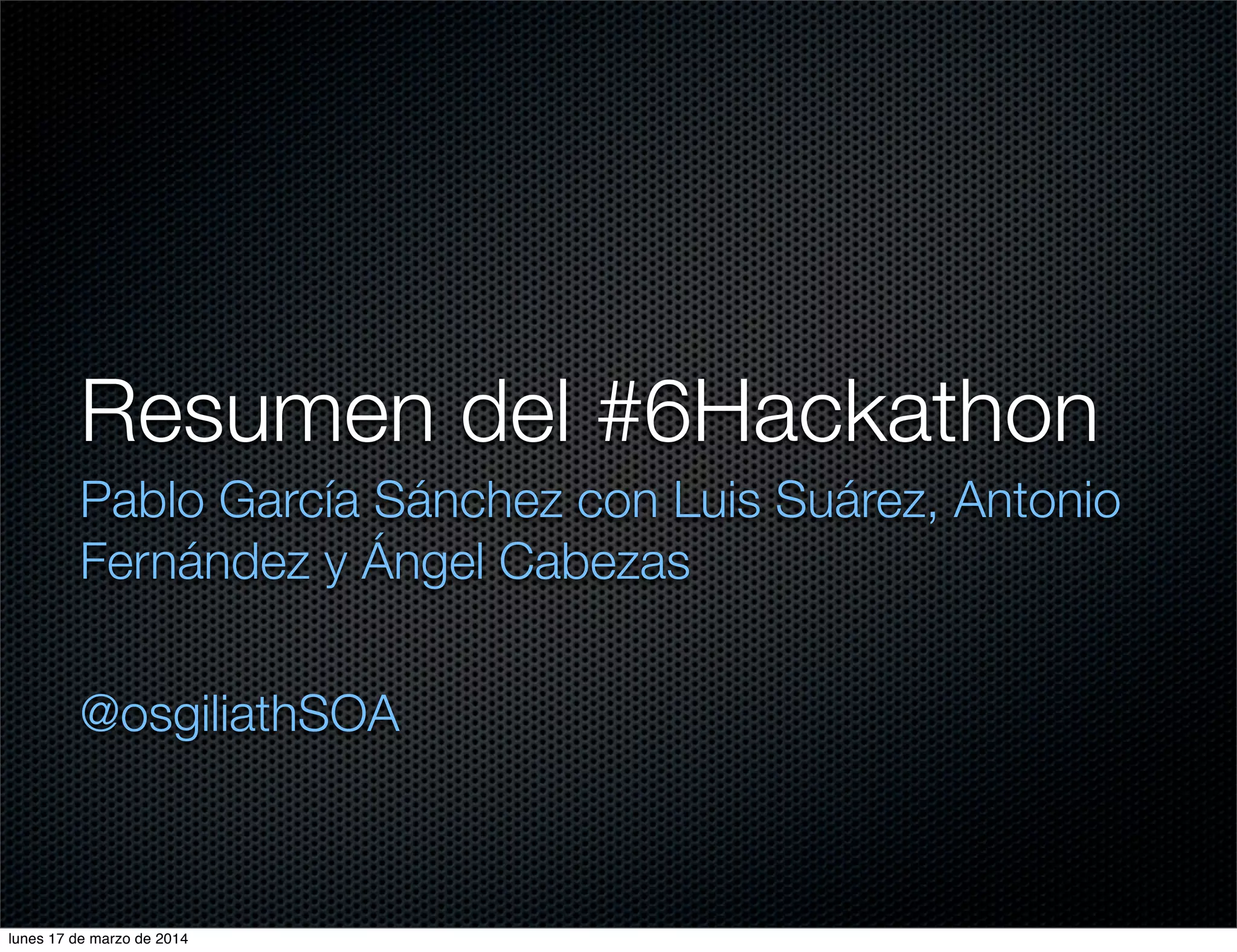 El documento resume un hackathon en el que participaron varias personas y se probaron nuevas primitivas gráficas como círculos, triángulos y cuadrados. También se propuso un nuevo operador de cruce que penaliza la agrupación de primitivas para favorecer una distribución más uniforme en la imagen, y otro operador que muta la posición y el color de forma separada. Finalmente, se discutió publicar la primera versión y escribir un artículo comparando los resultados.