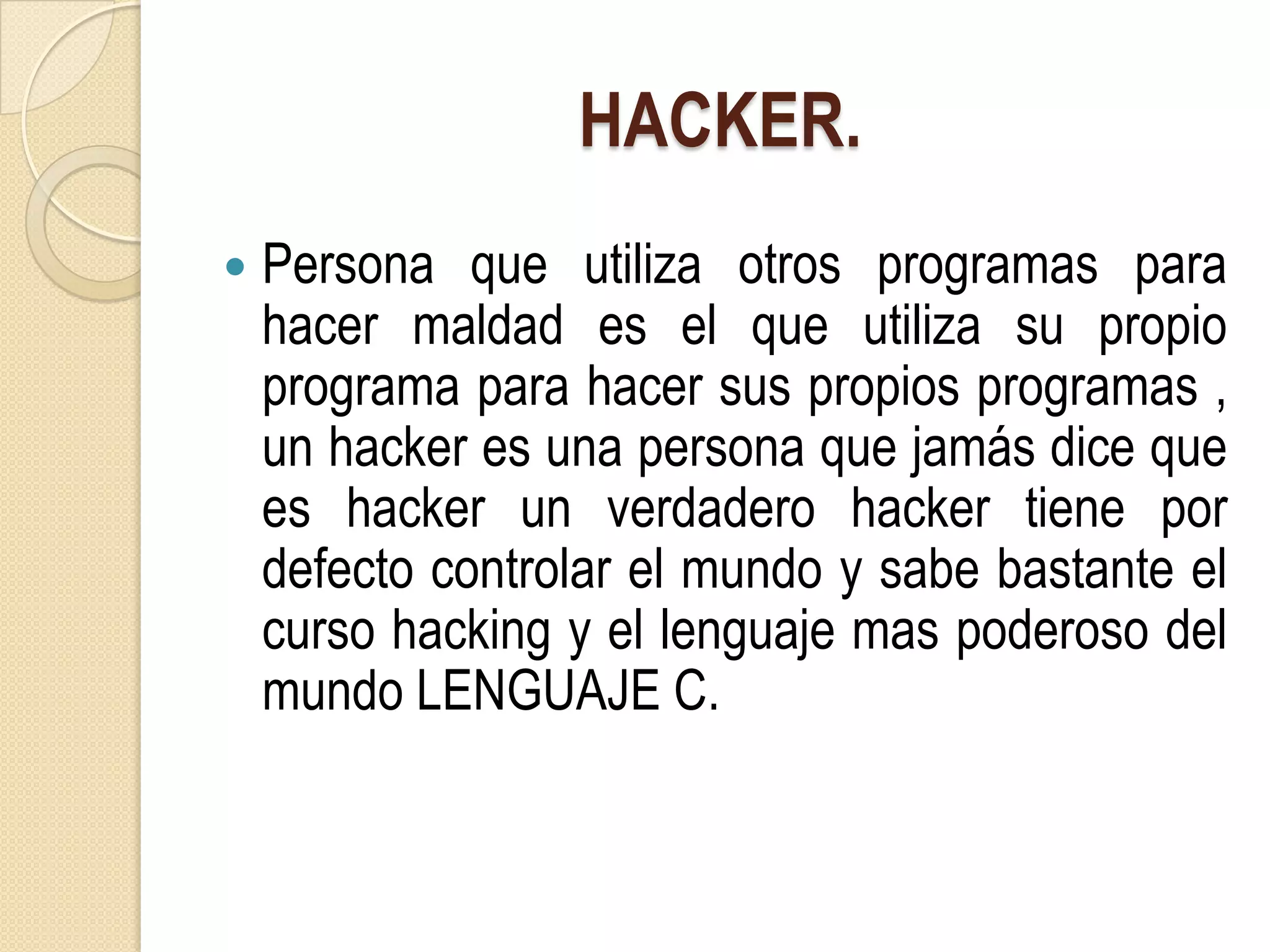 El documento describe diferentes tipos de hackers y crackers. Los hackers pueden ser personas que buscan vulnerabilidades en sistemas para fines buenos o malos, mientras que los crackers siempre usan sus conocimientos para fines maliciosos o ilegales como robar información o piratear software. Se mencionan hackers negros, phreakers, blancos, y crackers piratas, lamers y trasher.