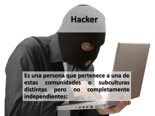 Este documento describe diferentes tipos de hackers, incluyendo hackers de sombrero negro que buscan vulnerabilidades de seguridad, hackers de sombrero blanco que ayudan a corregirlas, y script-kiddies que descargan programas de hacking sin comprenderlos completamente. También explica brevemente la historia del término "hacker" y cómo ha evolucionado su significado.