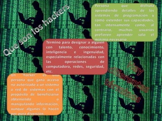 Este documento describe diferentes tipos de hackers, incluyendo wannabes que trabajan para empresas de seguridad informática, white hats que investigan vulnerabilidades de seguridad de forma legítima, y samuráis que están interesados en hacking pero aún no son reconocidos como expertos. También menciona algunos hackers notables como Gary McKinnon, quien realizó uno de los hackeos más grandes a sistemas militares estadounidenses, y el Capitán Crunch, uno de los primeros hackers.