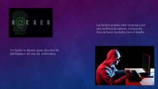 Este documento describe diferentes tipos de hackers: hackers de sombrero blanco que buscan mejorar la seguridad, hackers de sombrero negro que buscan dañar sistemas, y hackers de sombrero gris que pueden tener intenciones buenas o malas. También describe los pasos típicos de un ataque cibernético y algunos hackers famosos como Kevin Mitnick.