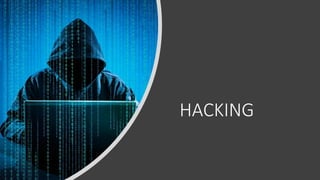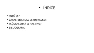 El documento define hacking como la búsqueda de conocimientos sobre sistemas informáticos, sus vulnerabilidades y mecanismos de seguridad. Describe las características de un hacker como investigar detalles de sistemas, ver cada penetración como un reto intelectual y tener pasión por la seguridad informática. Finalmente, ofrece consejos para evitar el hacking como no usar contraseñas débiles o predecibles, mantener el software actualizado y cambiar contraseñas si hay indicios de virus.