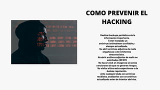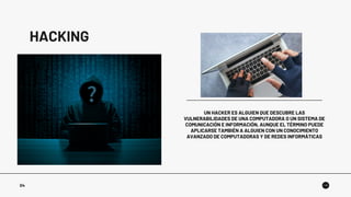 El documento define a un hacker como alguien que descubre vulnerabilidades en sistemas de computadoras y comunicación, y explica que el término también se aplica a personas con un conocimiento avanzado de computadoras y redes. Además, menciona que el hacking implica utilizar conocimientos técnicos en computación para superar problemas relacionados con la seguridad.