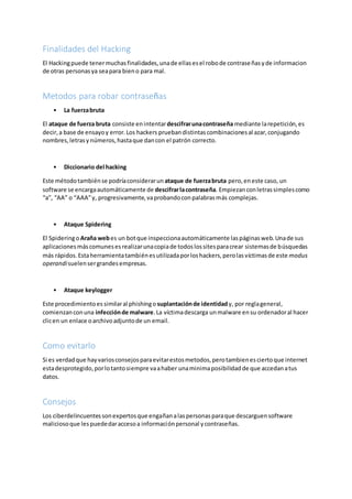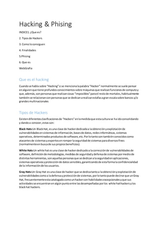 El documento habla sobre hacking y phishing. Explica que el hacking se refiere a personas con conocimientos de computación que realizan tareas imposibles y a veces ilegales. Describe tres tipos de hackers: black hats que atacan sistemas, white hats que buscan corregir vulnerabilidades, y gray hats que hacen ambas cosas. También explica métodos comunes que usan los hackers para robar contraseñas como fuerza bruta, diccionarios, spyware y keyloggers. Finalmente, describe el phishing como engañar a las víctimas para que revelen