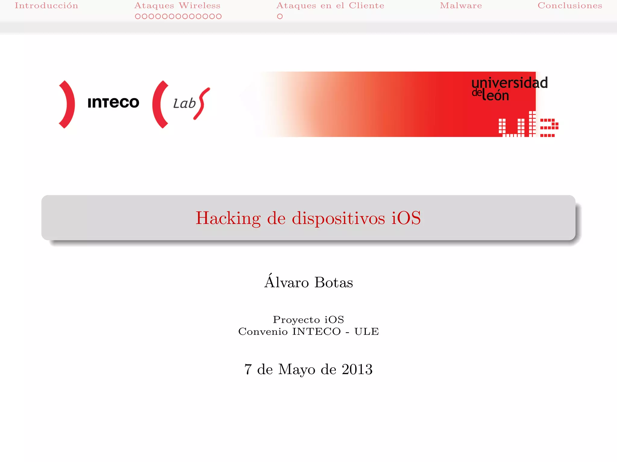 Este documento describe varios tipos de ataques inalámbricos y en el cliente contra dispositivos iOS. Explica cómo los ataques de redes abiertas, rogue Wi-Fis y sslsniff pueden comprometer la seguridad de las conexiones Wi-Fi. También describe cómo SSL stripping y los botnets pueden interceptar el tráfico HTTPS y infectar otros dispositivos en la misma red. Finalmente, detalla varios ejemplos de malware para iOS, tanto en la App Store como requiriendo jailbreak.