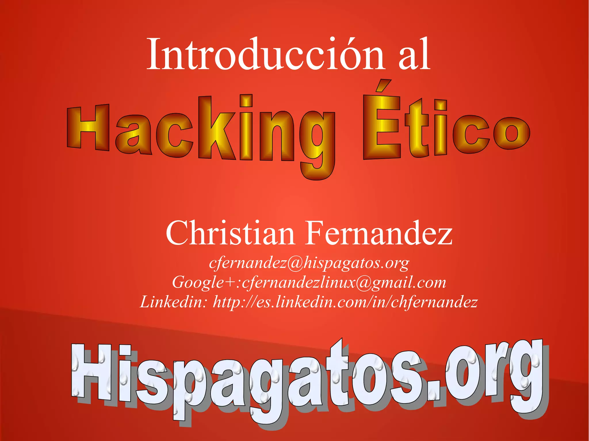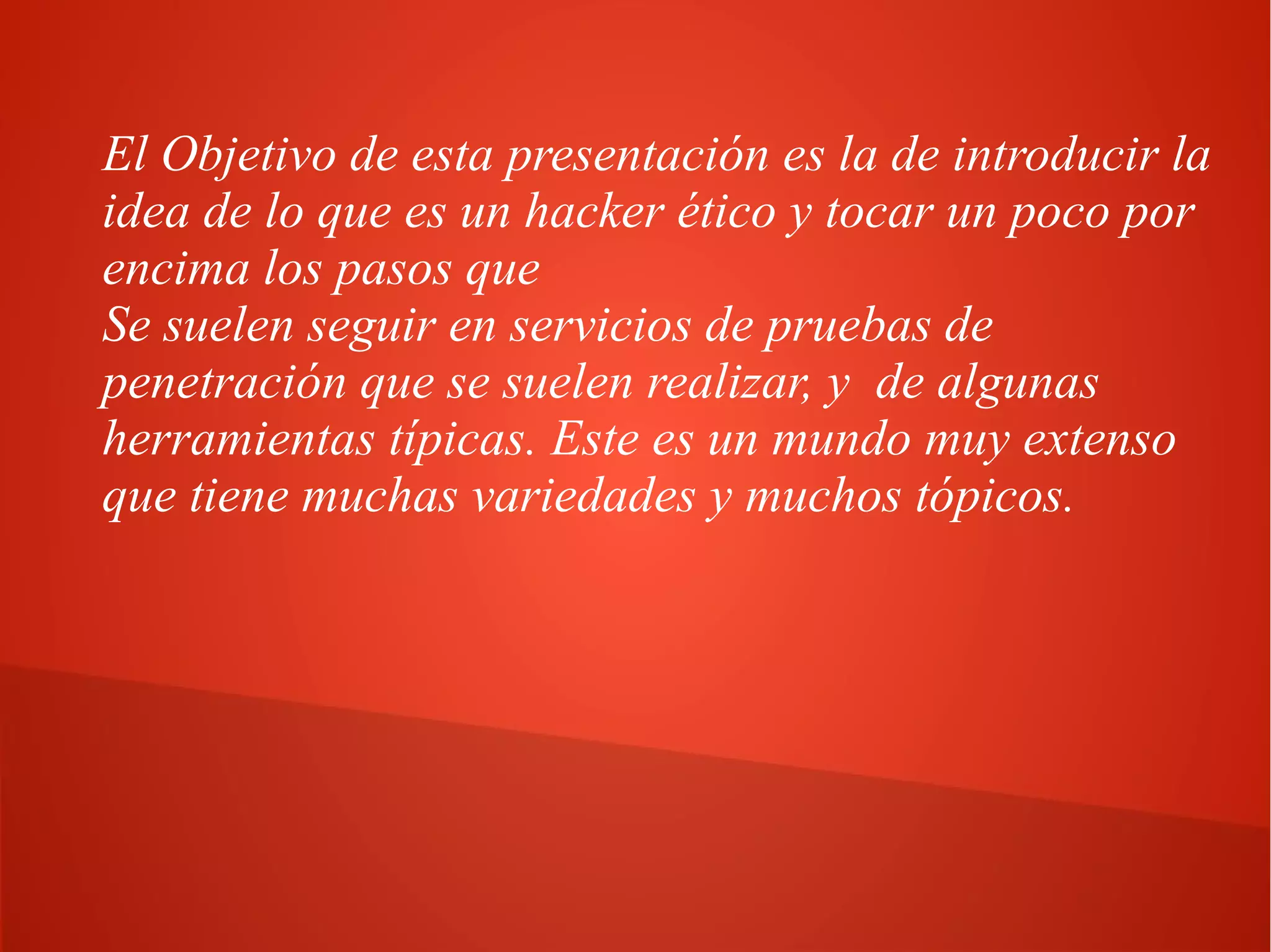 El documento presenta una introducción al hacking ético, definiendo conceptos clave como hacker y sus tipos: white hats, black hats y grey hats. Detalla el proceso de pruebas de penetración (pentesting) y la importancia de evaluaciones periódicas de seguridad para organizaciones, así como las diferentes modalidades y técnicas de ataques informáticos. Además, se mencionan las habilidades y conocimientos necesarios para un hacker ético, así como herramientas y metodologías comunes en el campo.