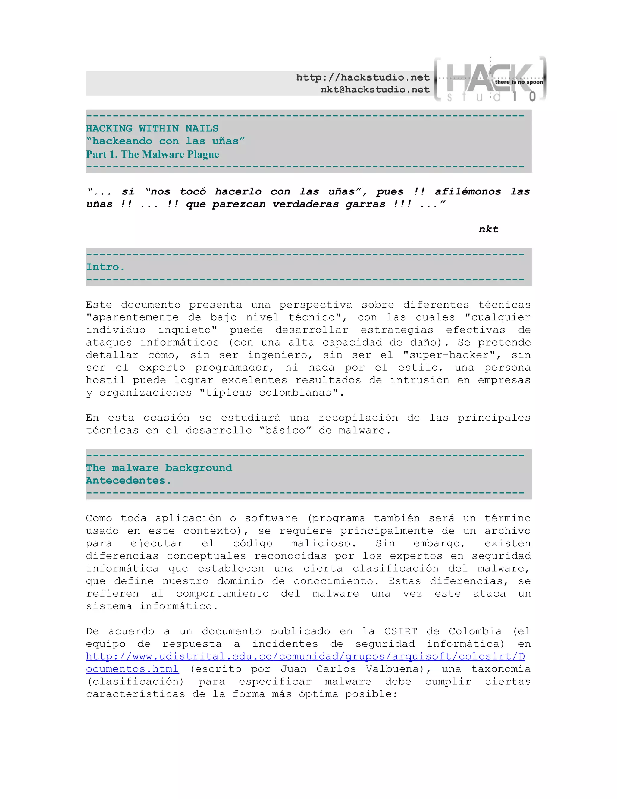 Este documento describe cómo crear malware de forma básica sin necesidad de habilidades de programación avanzadas. Explica cómo desarrollar una carga útil de backdoor usando netcat para abrir un puerto y establecer una conexión, y también analiza el uso de spyware. Luego detalla los pasos para empaquetar el malware, evadir detección e infectar otros sistemas dentro de una red. El objetivo es lograr resultados de intrusión usando técnicas de nivel básico.