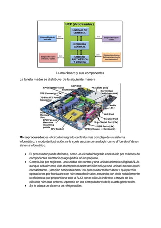 El documento describe los principales componentes de hardware de una computadora, incluyendo la tarjeta madre, procesador, memoria RAM y ROM, ranuras para tarjetas, puertos y periféricos. Explica los componentes de la tarjeta madre como el socket del CPU, ranuras para memoria y tarjetas, y conectores para alimentación, discos, USB y otros periféricos. También describe los periféricos de entrada, salida y entrada/salida.
