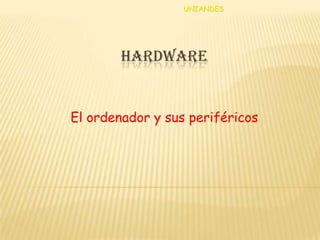 El documento describe los componentes principales de un ordenador y sus periféricos. Explica que un ordenador está compuesto por una placa base, procesador y memoria RAM. Luego detalla los diferentes tipos de periféricos de entrada, salida, entrada y salida, y almacenamiento, como teclado, ratón, monitor, impresora, disco duro y tarjeta de red. Finalmente, menciona elementos comunes de redes como router, switch y hub.