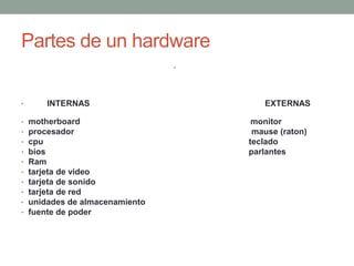 El documento describe las principales partes internas y externas de un hardware de computadora. Entre las partes internas se encuentran la motherboard, el procesador, la memoria RAM, la tarjeta de video y la tarjeta de sonido. Las partes externas incluyen el monitor, el mouse, el teclado y los parlantes.