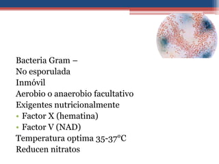 Este documento describe la bacteria Haemophilus influenzae, incluyendo su ecología, epidemiología, factores de virulencia, causas de meningitis y su tratamiento. H. influenzae es una bacteria gram-negativa, aerobia o facultativa, que requiere factores nutricionales específicos. Se divide en cepas encapsuladas y no encapsuladas, y la transmisión ocurre por contacto directo o inhalación. La meningitis es causada comúnmente por la cepa serotipo b e incluye síntomas como fiebre, dolor de cabeza y n