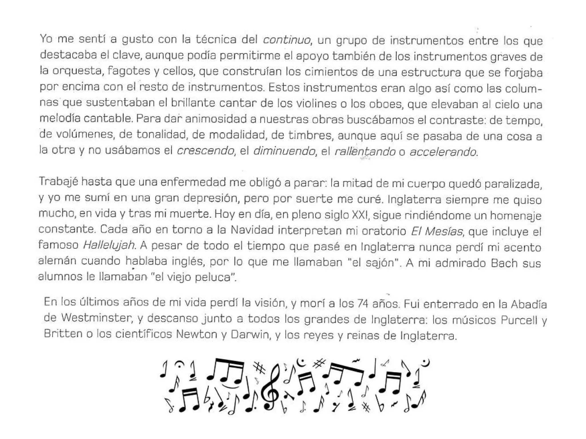 El documento proporciona información sobre el compositor G.F. Händel y los instrumentos musicales de la época barroca, incluyendo dos obras de Händel: "Música Acuática" y "Música para los Reales Fuegos Artificiales".