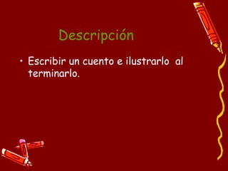 El documento proporciona instrucciones para escribir un cuento. Sugiere elegir un tema, título, personajes y situaciones. Recomienda escribir un borrador y hacer correcciones antes de la versión final. El tema propuesto es cómo los niños administran su primer dinero a través de las preguntas sobre ingresos, gastos, ahorros y el valor del dinero.
