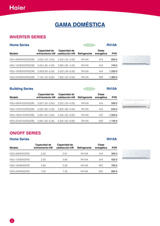 Este documento presenta una lista de modelos de aire acondicionado doméstico e industrial con sus especificaciones técnicas como capacidad de enfriamiento y calefacción, clase energética, refrigerante y precio de venta recomendado. Se dividen en series como inverter, on/off, multi split y unidades interiores y exteriores con detalles como alimentación eléctrica y diámetros de tuberías.