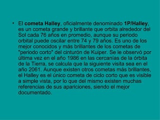 El cometa Halley orbita alrededor del Sol cada 76 años y es el único cometa de ciclo corto visible a simple vista. Se originó en la Nube de Oort y fue capturado por la gravedad de los planetas gigantes. La próxima aparición del cometa Halley será en 2061 y recibe su nombre en honor a Edmond Halley, quien predijo correctamente su regreso periódico en 1758.