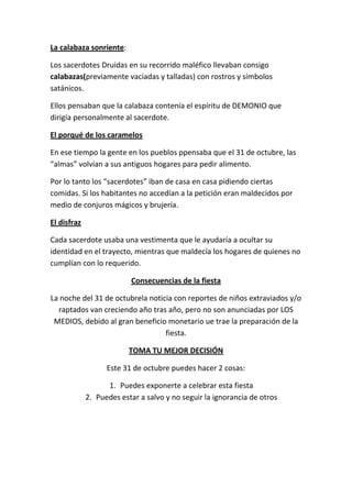 Halloween, o el 'día de las brujas', tiene sus raíces en rituales celtas y druidas, asociados a sacrificios y a la invocación de deidades como Samhain, dios de la muerte. Durante esta festividad, los druidas usaban calabazas talladas y pedían comida de casa en casa, amenazando con maldiciones si no eran atendidos. A pesar de los reportes de incidentes relacionados con la celebración, los medios evitan informar, priorizando los beneficios económicos del evento.