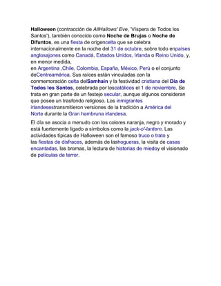 Halloween es una fiesta de origen celta que se celebra el 31 de octubre. Tiene sus raíces en la antigua festividad celta de Samhain y en la festividad cristiana del Día de Todos los Santos. Se asocia con colores como el naranja y el negro y símbolos como las calabazas decoradas. Algunas actividades típicas son pedir dulces puerta a puerta diciendo "truco o trato", fiestas de disfraces, hogueras y películas de terror.
