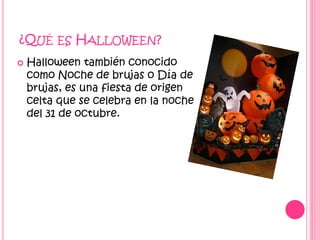 Halloween es una fiesta de origen celta que se celebra el 31 de octubre, conocida también como Noche de Brujas. Tuvo su origen en la tradición celta de honrar a los muertos en la víspera del Día de Todos los Santos y la costumbre de disfrazarse proviene de la creencia de que los muertos regresaban esa noche. Tradicionalmente se comen manzanas acarameladas u otras golosinas.