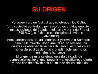 Halloween tiene sus orígenes en una antigua festividad celta llamada Samhain, en la que los druidas realizaban rituales y sacrificios a dioses paganos. Con el tiempo, esta tradición se incorporó a otras culturas pero mantuvo elementos de ocultismo y adoración a fuerzas oscuras. Aunque ahora es una celebración popular, sigue teniendo un fuerte vínculo con prácticas satánicas para algunos grupos.