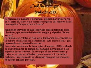 Halloween tiene sus orígenes en las tradiciones célticas y romanas. Los celtas celebraban el Samhain al final del verano, creyendo que permitía el paso de los espíritus. Más tarde, los romanos cambiaron la costumbre céltica y añadieron su propia fiesta de la cosecha en honor a Pomona, mezclando ambas tradiciones. Hoy en día, Halloween mantiene algunas de las costumbres originales de disfraces y máscaras para ahuyentar a los espíritus.