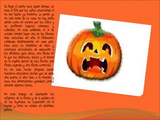 El documento resume los orígenes celtas de Halloween/Samhain como una fiesta para honrar a los muertos en la que se creía que el velo entre el mundo de los vivos y los muertos se abría, permitiendo que los espíritus regresaran. También explica cómo la tradición se expandió a América del Norte con los colonos británicos y irlandeses y evolucionó en la celebración comercial actual.